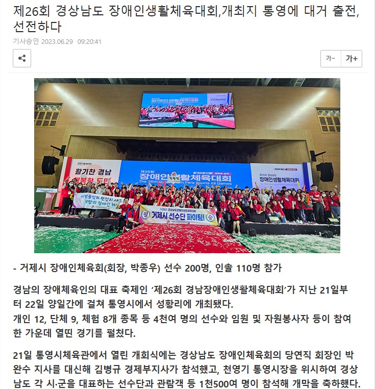 제26회 경남장애인생활체육대회(2023.6.21~22) 관리자 0 3319 2023.07.03 09:16 거제타임라인 모바일 사이트, 제26회 경상남도 장애인생활체육대회,개최지 통영에 대거 출전, 선전하다 (gjtline.kr)