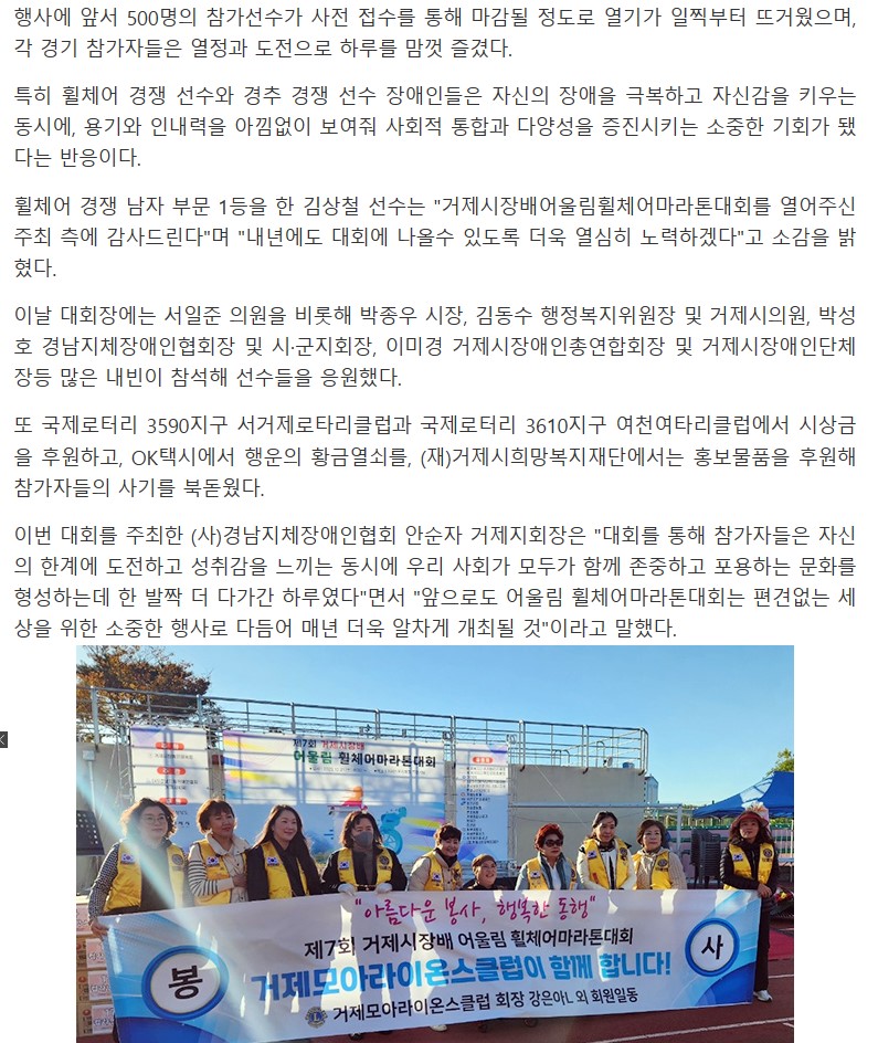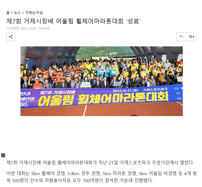 제7회 거제시장배 어울림 휠체어마라톤대회 관리자 0 3081 2023.10.25 13:48 http://m.geojejournal.co.kr/news/articleView.html?idxno=88868 + 1900 제7회 거제시장배 어울림 휠체어마라톤대회 2023. 10. 21.(토) / 거제면일원